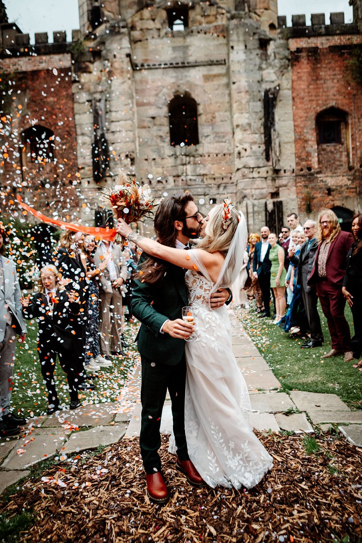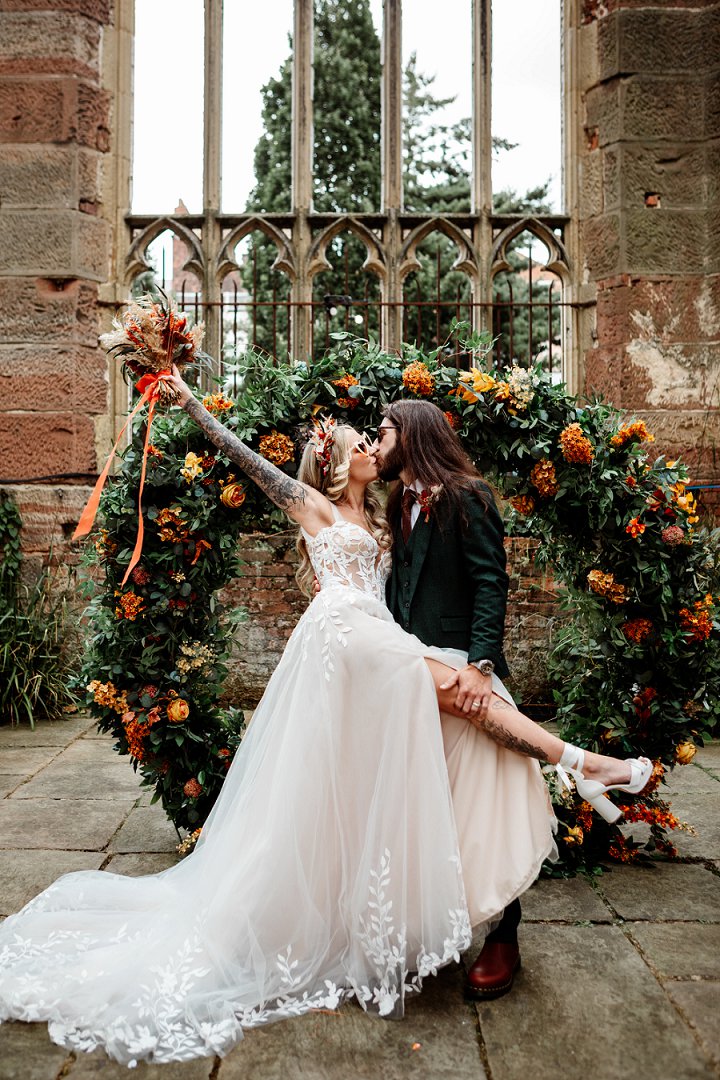 Jade and Jay were married on 9th August 2025 at St Lukes Bombed out church, Liverpool with the reception at The Crafty Swine, Liverpool. ‘When Jade first moved to Liverpool, she walked past a wedding set up at the bombed out church, it was breath takingly beautiful! And she instantly thought “I want to get married here”. The whole vibe was just us – gothic, natural and a bit different. Jay is a tree surgeon and Jade is a vet nurse, we wanted a nature vibe intertwined with our rock n roll music taste, which is super important to us! We had 60 guests with 100 at the reception, it took about a year to plan.’