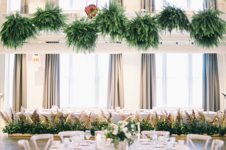 A lot of greenery, hanging ferns above the dance floor, ferns in the centrepieces. Basically everything was white and green. I had pompous grass down the aisle at the church.