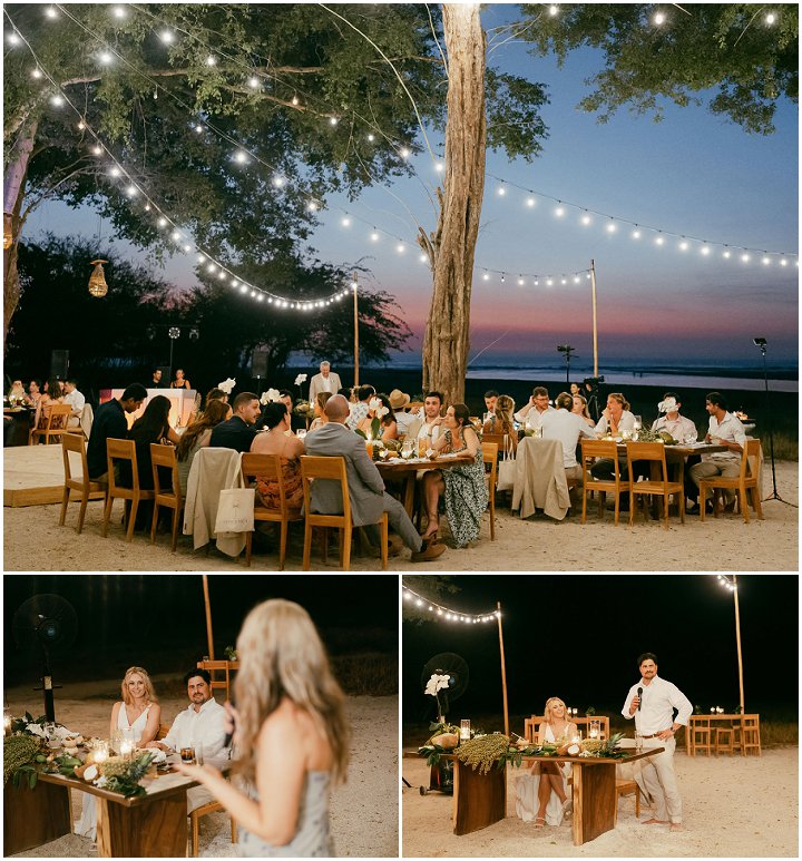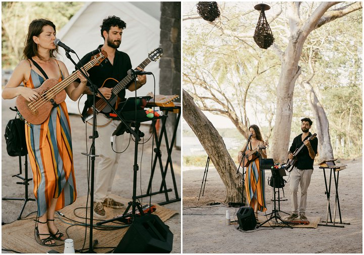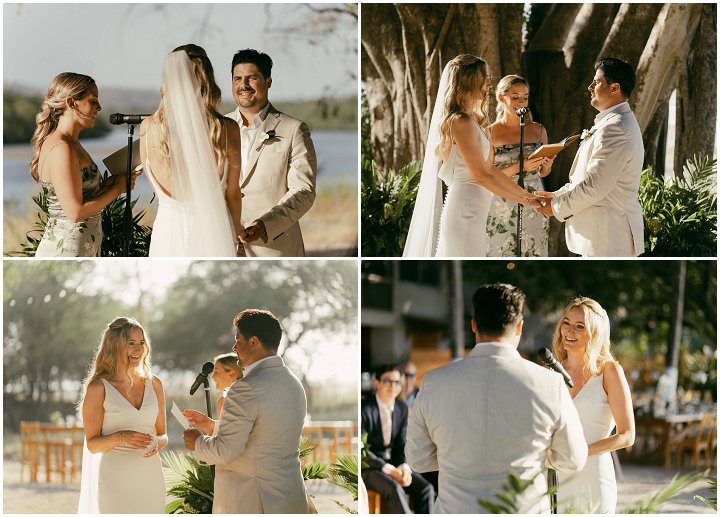 The beachfront ceremony took place at Pangas Beach Club under the shade of large mangrove trees, with the jungle and mountains providing a breathtaking backdrop. The natural beauty of the setting was enhanced by simple decor—potted plants with greenery and white blooms, natural wood accents, and real coconuts marking the aisle’s start.