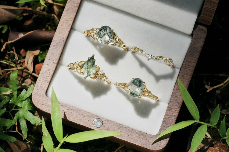 GemsMagic is renowned for crafting nature-inspired, handmade rings that reflect the organic beauty of moss agate. Their collection of moss agate rings features a wide variety of designs, from delicate leaf and vine motifs to lunar-inspired crescent and floral patterns. Each ring is meticulously crafted to highlight the stone’s natural inclusions, ensuring that every piece is unique.