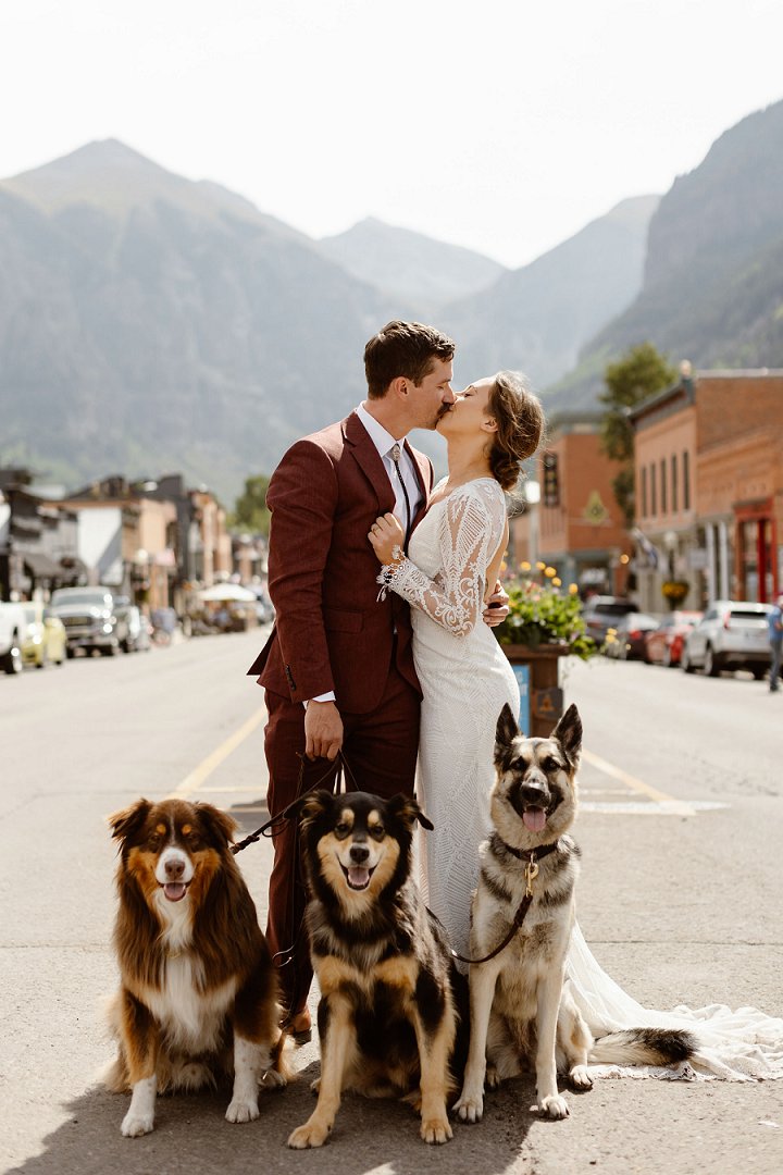 After the couple had a few minutes of alone time and their first look, we headed into downtown Telluride to get some downtown pics! We walked through the town with their three dogs in tow, and were on our way up to San Sophia Overlook for their ceremony! Before their ceremony, Kira and Rob carved out plenty of time up at the overlook to spend time with their three dogs way before all the guests started to arrive. It was such a fun moment in the day. We got some really epic shots of the 5 of them just having fun and being super relaxed before the ceremony.
