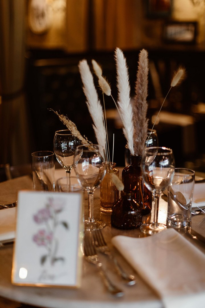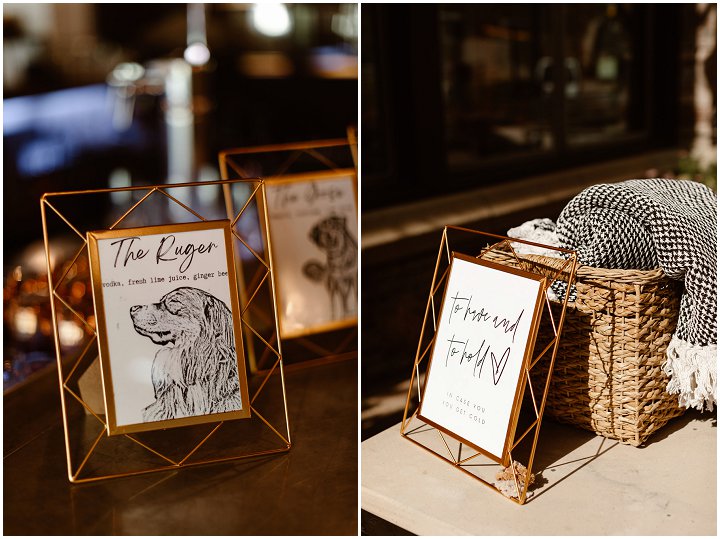 After the ceremony, there was a cocktail hour followed by dinner and celebrating at the Tomboy Tavern. Kira designed the entire indoor reception details. Dried florals were placed in neutral glass colored vases, hand made table settings with wild flower illustrations told guests which table to sit at, and last but not least, there were three signature drinks for the guests to choose from, all named after their three dogs. Kira’s father, Kira’s best friend, and Rob’s mother all took a moment to toast the new happily married couple. And as the sun set on the San Juan mountains, the couple rode the gondola back up to San Sophia Overlook for sunset and blue hour photos.